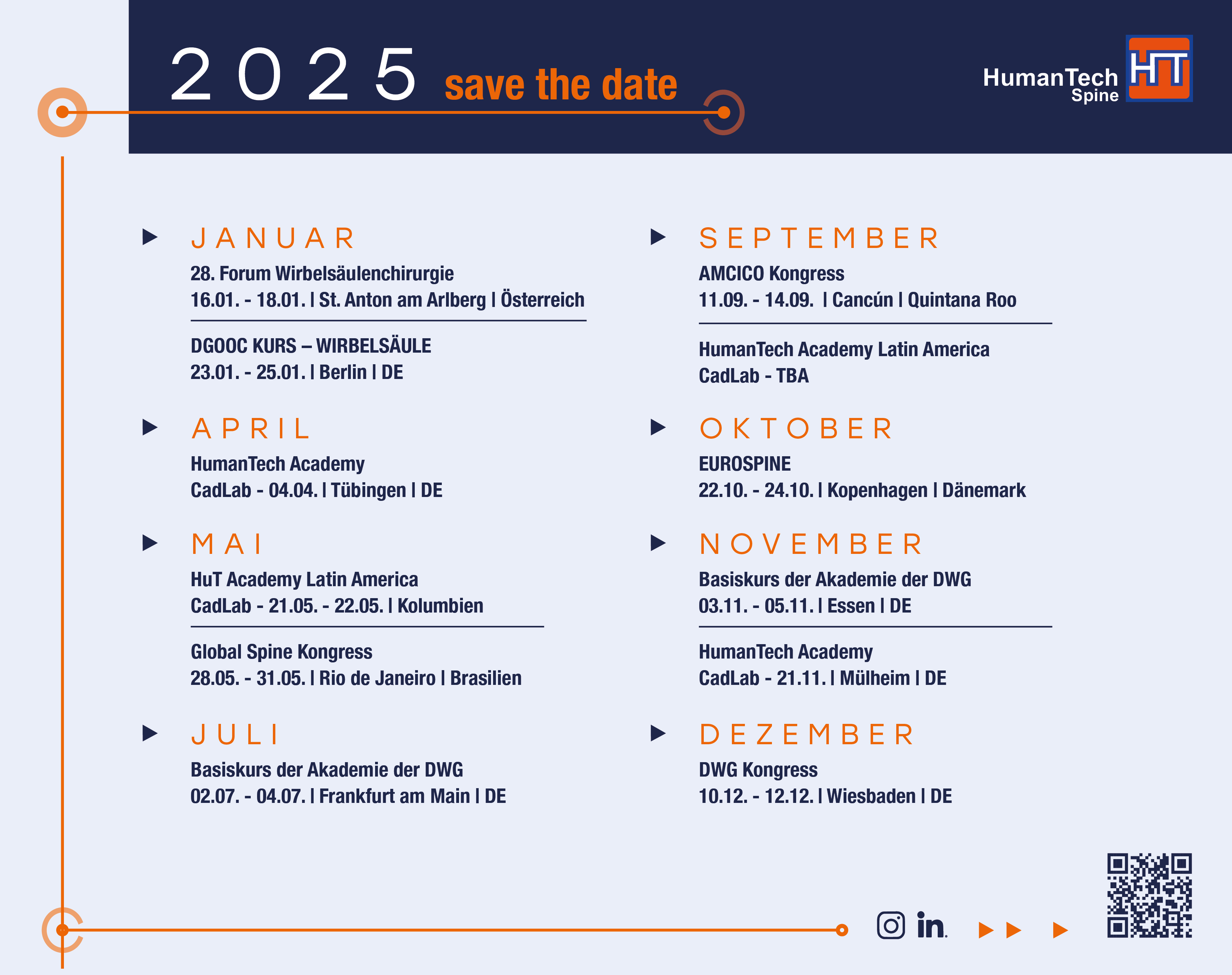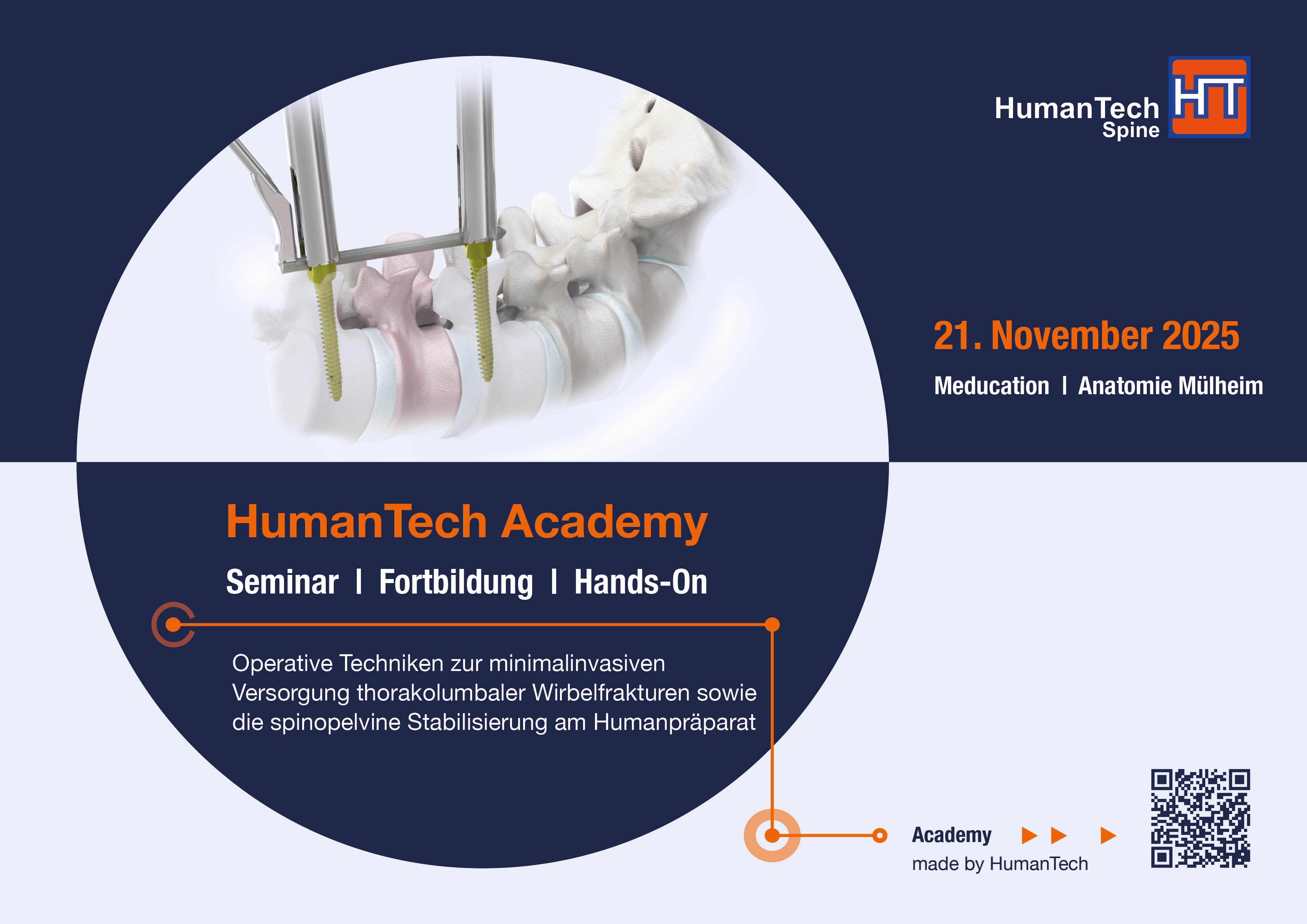 Beim diesjährigen Basiskurs der DWG-Akademie in Frankfurt ist HumanTech Spine mit dabei. Drei intensive Kurstage bieten spannende Einblicke und praxisnahe Weiterbildung in der Wirbelsäulenchirurgie. Wir freuen uns auf den Austausch und inspirierende Begegnungen vor Ort!